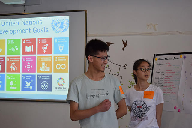 二楼天台的教室里,一位来自圣劳伦斯大学的美国女孩正打开空调,她下午在这里和20名高三毕业生探讨了全球气候变暖,贫穷饥饿,可持续发展和性别平等,晚上的授课时间是属于小学生的。